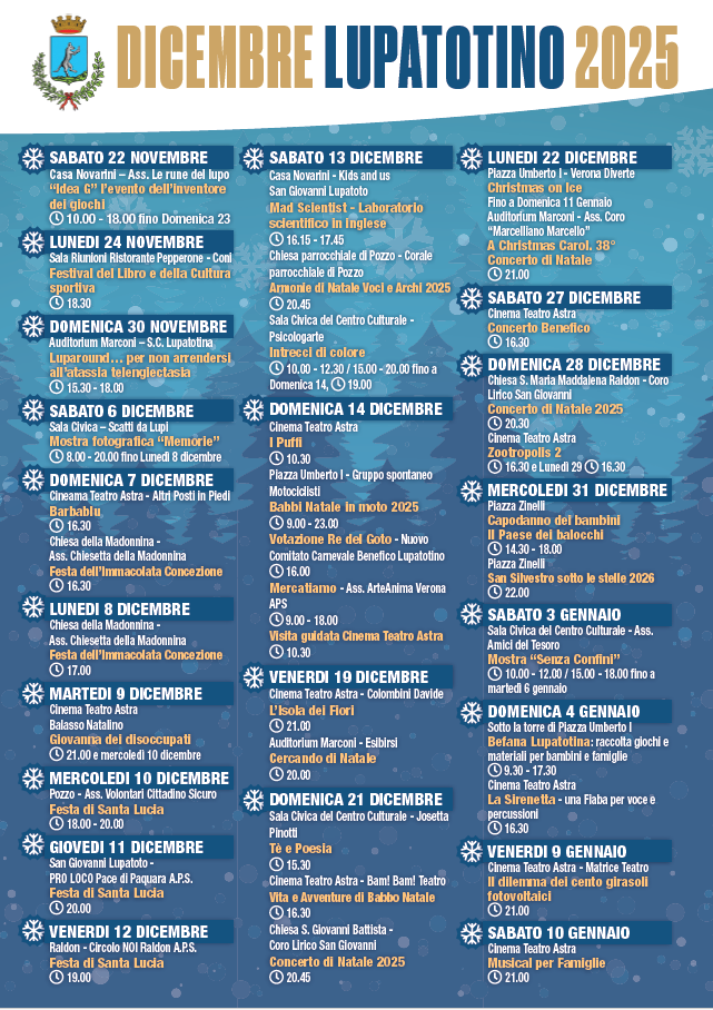 Con il mese di dicembre, la città si avvolge di colori, luci e soprattutto, di tanta cultura. All’interno della rassegna “Dicembre lupatotino 2025”, si svolgeranno numerosi eventi ludici e culturali eventi culturali: spettacoli, concerti, feste, mostre e tanto altro. Verranno valorizzate le tradizioni locali e promossa la partecipazione della comunità Lupatotina.
