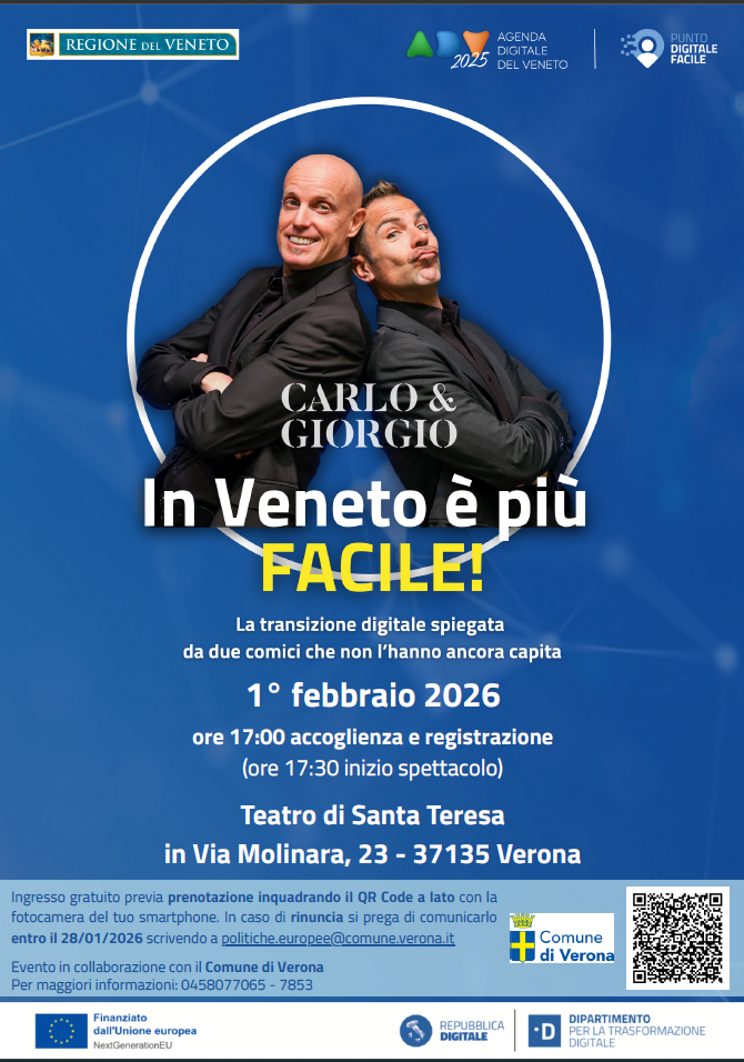 Nell’ambito del progetto “Rete di Servizi di Facilitazione Digitale”, il Comune di Verona promuove l’evento “In Veneto è più FACILE! la transizione digitale spiegata da due comici che non l’hanno ancora capita”