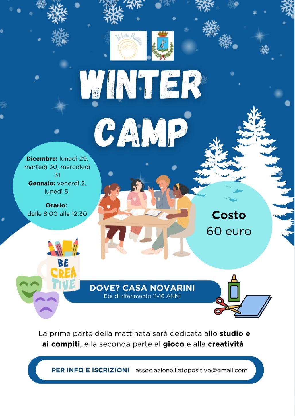 L’Associazione “Il lato positivo”, propone il progetto denominato “Winter Art Camp”, che si svolgerà a Casa Novarini nelle giornate del 29, 30 e 31 dicembre 2025 e del 2 e 5 gennaio 2026, dalle ore 8.00 alle 12.30. Il progetto è rivolto ai ragazzi delle scuole secondarie di primo grado e verrà proposto un laboratorio di teatro per dare opportunità ai ragazzi di sperimentarsi nel campo della recitazione, dell’introspezione e conoscenza di sé.